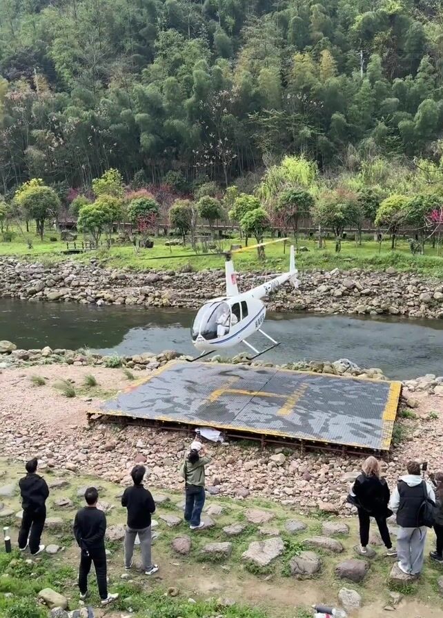 A white helicopter takes off from a metal platform on a riverbank. Several people stand nearby and watch, one of whom appears to be filming the event. The riverbank is rocky with patches of green grass. On the opposite side of the river is a manicured green space with trees and low shrubs, beyond which is a wooded hillside. The sky is overcast.