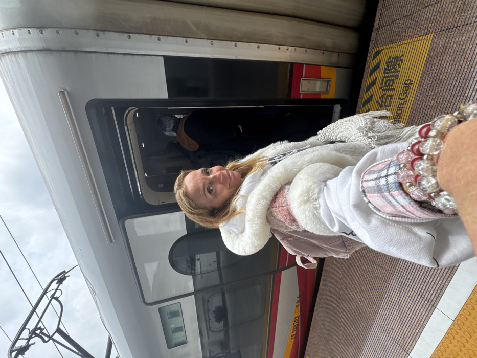 The scene depicts a woman on a train platform in Furong, China, posing for a selfie-style photograph