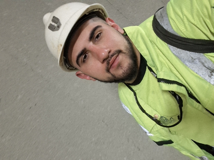 An adult male is depicted in a close-up, slightly upward-angled, eye-level shot against a plain light grey background, likely a wall, in an indeterminate indoor location in the city of Unknown, Unknown. The male subject, appearing to be in his 20s or 30s with dark hair, dark eyes, and a trimmed dark beard and mustache, is wearing professional safety attire. This includes a white hard hat with a silver-colored shield emblem on the front, showing some minor dirt accumulation. He is also wearing a neon yellow-green high-visibility jacket or vest with black trim and soiled grey reflective stripes. A pair of dark-tinted safety glasses, identified as DeWalt brand, are suspended around his neck by a black strap, resting on his chest over the jacket. The subject looks directly at the camera with a neutral expression. No other individuals or significant objects are visible.