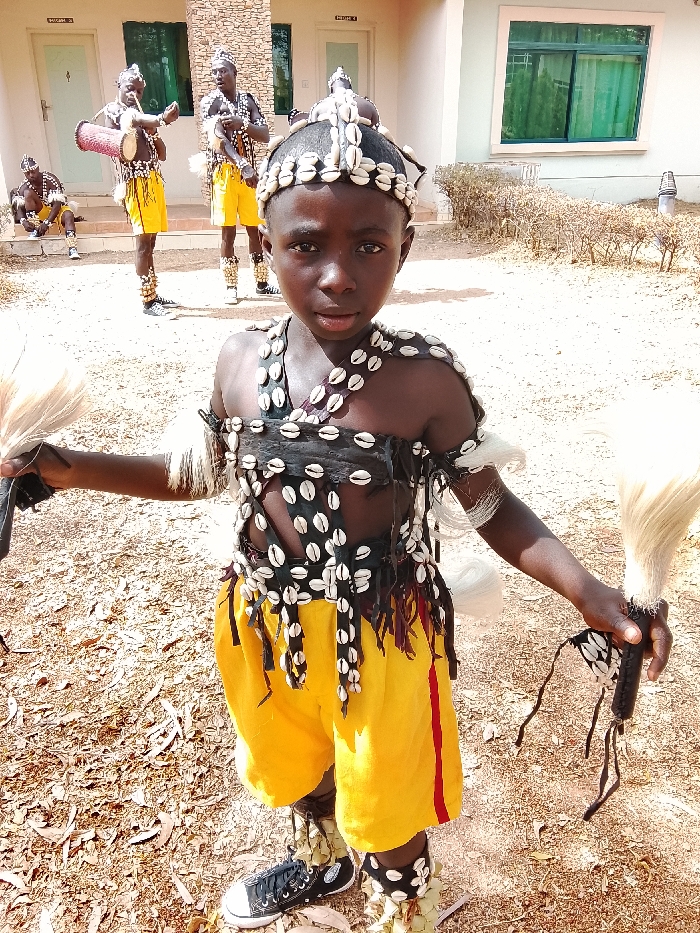 The image depicts a cultural gathering in the city of Nabatum, Nigeria, featuring five dark-skinned individuals in traditional attire against a backdrop of a light-colored building. In the foreground, a young person, approximately 6-10 years old, with a neutral expression, faces the camera. This individual wears a black sleeveless top and yellow shorts with red side stripes. The top and a headpiece are extensively adorned with white cowrie shells. White fibrous material wraps around the upper arms and ankles, with additional green foliage elements on the anklets. Black high-top sneakers with white laces are worn. Each hand holds a white, bushy fly-whisk. In the midground, four adult males are present. One man on the left is standing and playing a djembe-style drum. Another man to his right is standing and playing a small horn instrument. Both are dressed in yellow shorts and headwear adorned with cowrie shells. A third man is seated on a step to the far left, also in similar attire. The fourth man is partially visible standing on the far right. The scene takes place outdoors on dry, reddish-brown ground scattered with leaves. Behind the individuals stands a light-colored building with multiple doors and windows. Two doors are labeled "ROOM 3" and "ROOM 4" above them. The windows feature green tinted glass. Trimmed shrubbery is visible in front of the building.