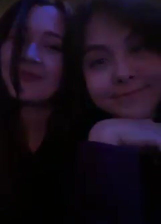 Two young women are captured in a dimly lit setting, possibly a bar or club. The woman on the left has long, dark hair and appears to be speaking or singing, based on the subtle movements of her mouth. The other woman on the right has short, dark hair and maintains a slight smile, with her head gently resting on her hand or arm. They are both facing the camera. The background is dark and blurred, with some indistinct lighting fixtures visible. The overall mood is casual and friendly.