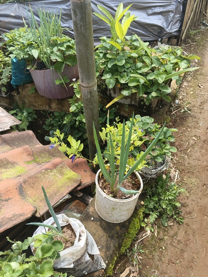 This image depicts a small, densely cultivated garden area located in ឃុំ ផាត់សណ្ដាយ, Cambodia. The scene is observed from a slightly elevated perspective. The foreground features reddish-brown roof tiles, heavily covered in green moss, and to their right, a white plastic bag serving as a planter for green onions and possibly strawberry plants. Further to the right, a white plastic bucket also contains several green onion plants. These planters rest on a concrete or stone ledge, which is partially covered in moss. A weathered, light-colored bamboo pole stands vertically near the center of the frame. To the left of the pole, a large purple plastic pot holds green onions and strawberry plants. To the right of the pole, several square or rectangular dark-colored containers are filled with thriving strawberry plants. A plant with yellowish-green new leaves grows among the strawberries in one of these containers. A blue fabric or plastic bag, acting as a planter, is partially visible on the far left. In the mid-ground, a vine with purple butterfly pea flowers is visible growing near the moss-covered tiles. The background shows more dense green foliage, including additional strawberry plants. A dark, possibly black, plastic tarp or sheeting is visible in the upper background, covering an obscured structure. The right side of the image features a bare, brown dirt path. No people are present in the scene. The lighting suggests natural daylight.