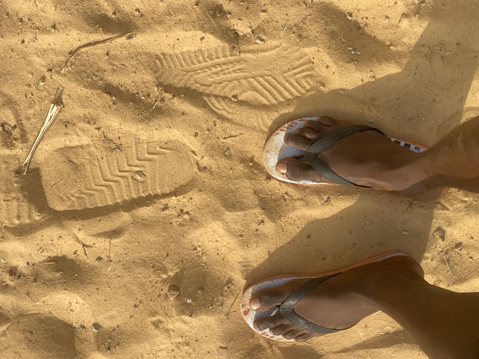 A ground-level perspective shows sand with clear imprints of shoe soles. To the right are two feet wearing flip-flops, each foot positioned at a slightly different angle. The sand is golden brown with subtle shadows indicating light from above. A small stick or stem lies near one of the sole imprints, adding to the natural texture of the sandy surface. The image captures a casual, candid moment on a sandy ground.