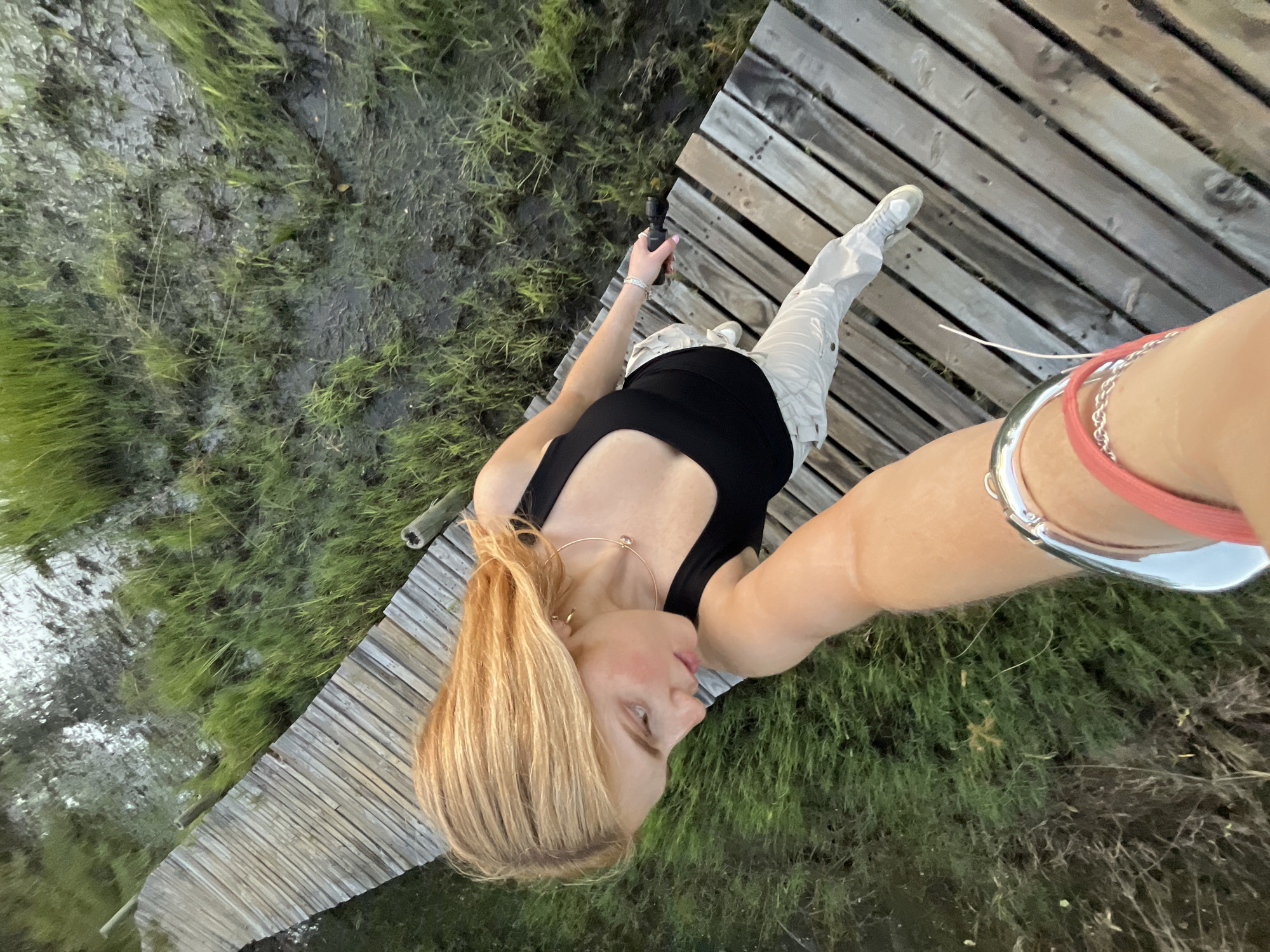 fair-skinned female with shoulder-length blonde hair, wearing a black tank top and light-colored pants, standing on a wooden boardwalk