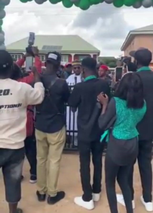 crowd of people gathered around a gate decorated with green and gray balloons. A man in white is standing behind the gate. Several people in the crowd are holding up phones and cameras, seemingly taking pictures or videos of the man. The environment appears to be outdoors, with buildings and trees visible in the background.