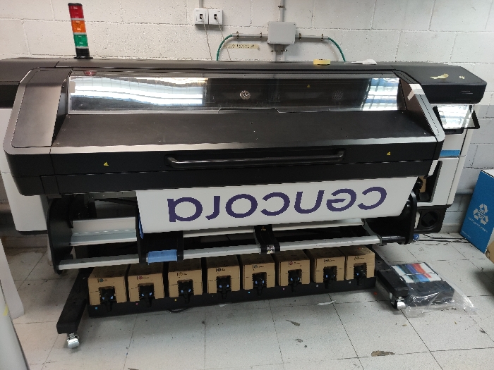 A large, wide-format printer, likely an HP model, stands in a room against a white brick wall with electrical fixtures. The printer has a black top and a white front with the word "cencora" printed in reverse. Underneath the printer, there are ink cartridge boxes and a sealed set of ink cartridges. A safety light is visible on top, indicating printer status. The area around the printer includes a recycling bin, suggesting a print shop or office environment.