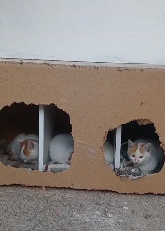Two white kittens with orange spots are resting inside a homemade cat house made of brown wood and white panels. The cat house is located on the ground next to a white wall. Both kittens appear to be resting comfortably.