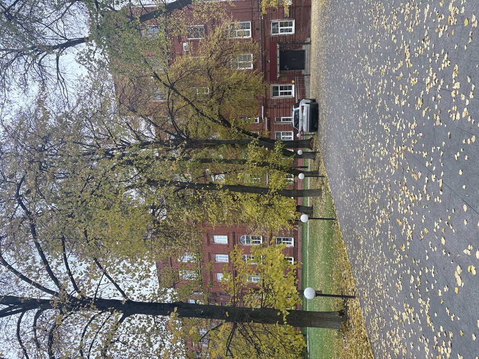 The image displays an autumnal exterior view of a multi-story red brick building, identified as part of Voronezh State University (VSU) on Universitetskaya Square, Voronezh, Russia. The building features numerous white-framed windows, including both rectangular and arched designs. A dark grey paved driveway or path, heavily scattered with fallen yellow leaves, extends from the foreground towards the building. A series of six white spherical lampposts on black poles line the right edge of the paved area. To the left, a green lawn is also covered with scattered yellow leaves. Several deciduous trees with significant yellow autumn foliage and some visible bare branches stand prominently in the midground, partially obscuring the building. A light-colored SUV, identified as a Lexus, is parked with its rear facing the viewer near an entrance on the right side of the building. The sky overhead is overcast. No individuals are present in the scene, and no actions or interactions are depicted.