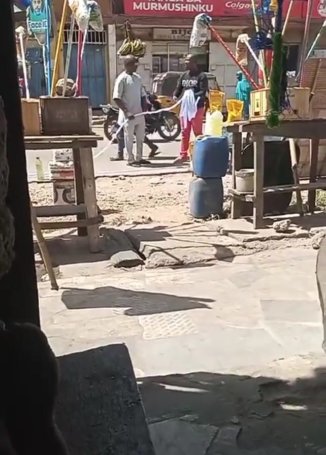 street scene in an urban area, viewed from a partially shaded area, likely a shop. There are two men standing in the street, seemingly engaged in a conversation. One man is wearing a white shirt and light-colored pants, while the other is wearing a dark shirt with white writing and red pants. Between them are two blue plastic barrels. Behind them, a yellow vehicle (possibly a tuk-tuk) drives by. The street is lined with shops, including one with a sign that reads "YANGA DA MURMUSHINKU." In the foreground, there are wooden tables laden with various items, including colorful brooms and brushes. There is a box on one of the tables. The tables appear to be street vendors' stalls. A small portion of a person's foot is visible in the lower left corner of the frame. The overall environment appears to be sunny.