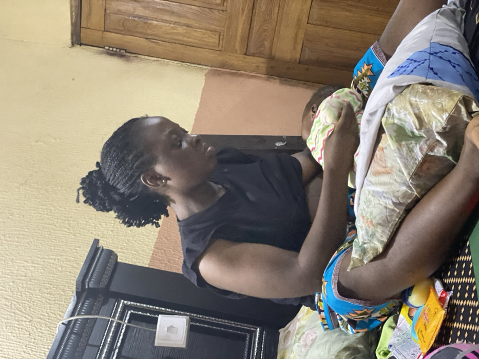 A woman with braided hair holds a baby against her chest. She wears a black t-shirt, and the baby is draped with a patterned fabric. The woman is seated, with pillows and colorful objects surrounding her. Behind her are a wooden ceiling, a textured wall, and the edge of a dark cabinet with a light switch. The image is slightly rotated clockwise.