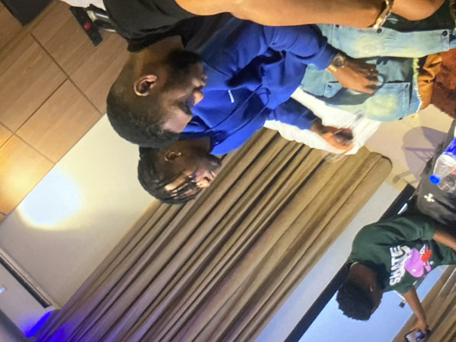 Three men are in a room, one in a blue hoodie, another in a black T-shirt, and the third in a green “SKATE” shirt. The man in the blue hoodie is wearing a watch, and there is a denim jacket with brown trim on the bed next to him. The room has beige curtains and wood paneling. A water bottle is visible in the lower right corner of the frame.