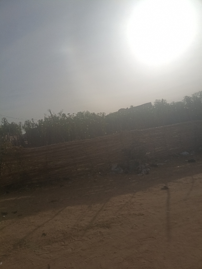 The image depicts an outdoor scene in Dabawa, Nigeria, under a bright, hazy sky with an intense light source, presumed to be the sun, prominently situated in the upper right quadrant. The foreground consists of reddish-brown earth displaying multiple parallel linear patterns, consistent with tilled ground or vehicular tracks. A dense band of green vegetation, appearing as tall, slender plants, extends horizontally across the mid-ground. In the background, partially obscured by this vegetation and atmospheric haze, indistinct dark structures are visible. No individuals or active subjects are present. Scattered refuse is visible on the ground in the lower right portion of the frame.