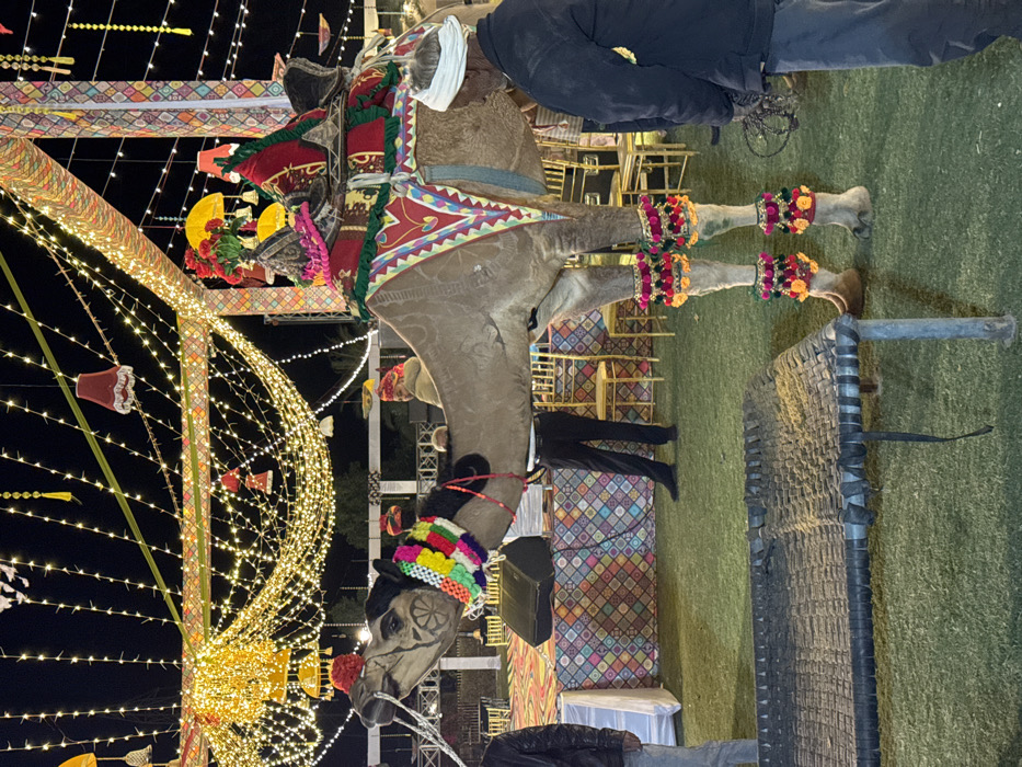A decorated camel stands on a patch of green grass at night. The camel is adorned with colorful garb and garlands, and a white turban sits on its head. Behind the camel, a large, curved structure is illuminated with fairy lights, adding to the festive atmosphere. There are people standing around, dressed in dark clothing. In the background, colorful cushions and chairs are visible, indicating a celebration or gathering.