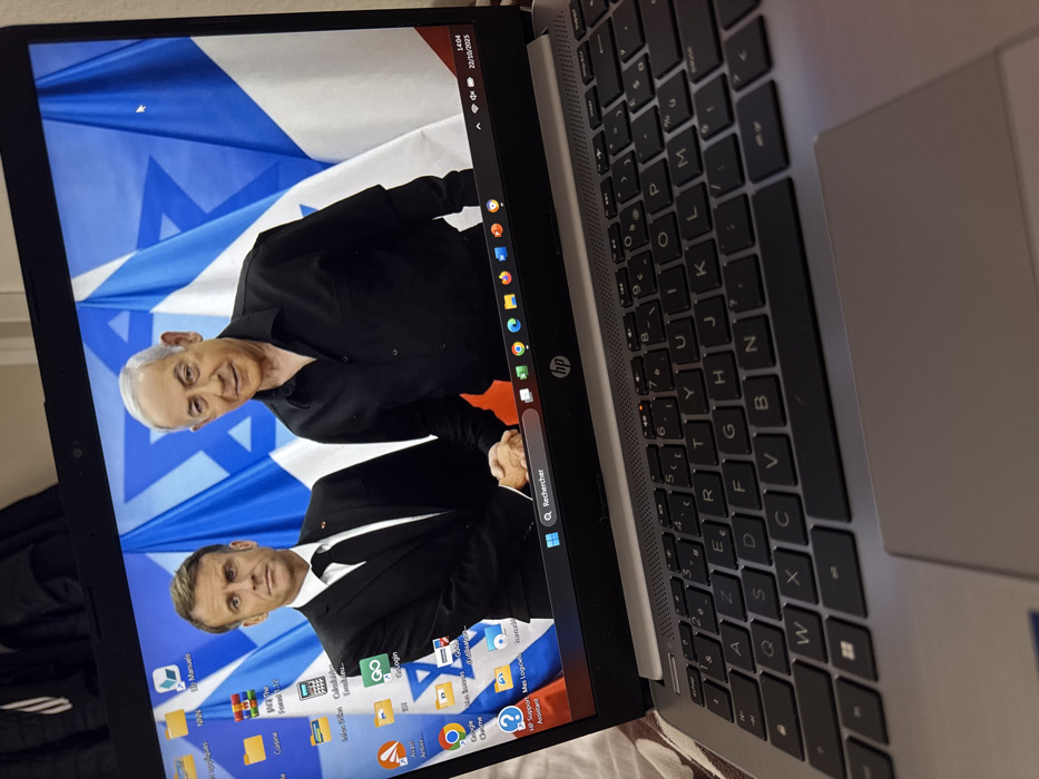 An HP laptop is depicted in an indoor setting in Bischheim, France, resting on a light-colored, textured surface. The laptop screen displays a desktop wallpaper featuring a composite image of Emmanuel Macron, dressed in a black suit with a white shirt and tie, shaking hands with Benjamin Netanyahu, who is wearing a black collared shirt. Behind them are visible depictions of the French national flag (blue, white, red vertical stripes) and multiple Israeli national flags (blue Star of David on a white field, with blue stripes). The laptop's Windows 11 desktop shows various application icons including Google Chrome, HP Support Assistant, and folders such as "NNN" and "CUISINE," alongside an Israeli flag icon. The taskbar at the bottom of the screen displays the time and date as "14:04 22/10/2025" and includes a search bar labeled "Rechercher." The laptop itself is silver-grey with a black French AZERTY keyboard and a large trackpad. A dark object is partially visible in the blurred background behind the laptop screen.