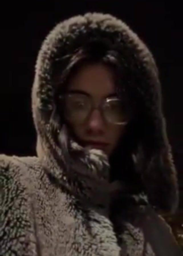 A close-up shot features a person wearing glasses and a fur-lined hood, possibly attached to a coat. The background is dark, suggesting a nighttime setting. The person is looking directly at the camera.