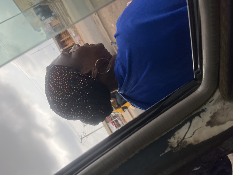 The image displays a side-profile view of a dark-skinned woman looking out of a vehicle window in Nyanya, Nigeria