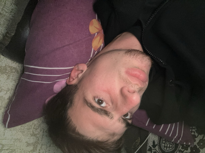 An indoor scene, located in Bulishi, Georgia, depicts a single young adult male from the upper torso up. The male is lying down, his head resting on a purple pillow. He possesses short, dark brown hair and light stubble on his chin. He is attired in a black zippered top over a dark undershirt. His head is angled slightly to the right, with his right eye open and directed towards the camera. His lips are pursed into an 'O' shape. The pillow beneath his head is purple, adorned with white horizontal stripes and a partial orange and yellow floral pattern. In the background to the left of the subject, a dark, intricately patterned textile object is visible. To the right, a light-colored, textured wall forms the background. The lighting is dim, primarily illuminating the subject's face.