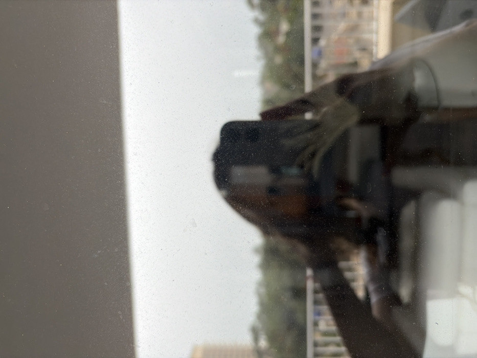 A person is reflected in a dusty window, holding a mobile phone. The reflection captures the person’s face, arm, and the phone they are using to take the picture. Outside the window, there's a blurred view of trees and a building. The window’s surface is visibly marked with dirt and dust particles.