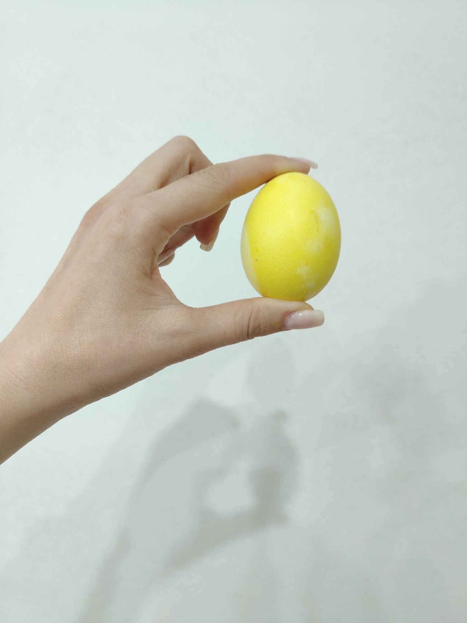 A fair-skinned person's hand holds a yellow Easter egg between their index finger and thumb against a plain white background