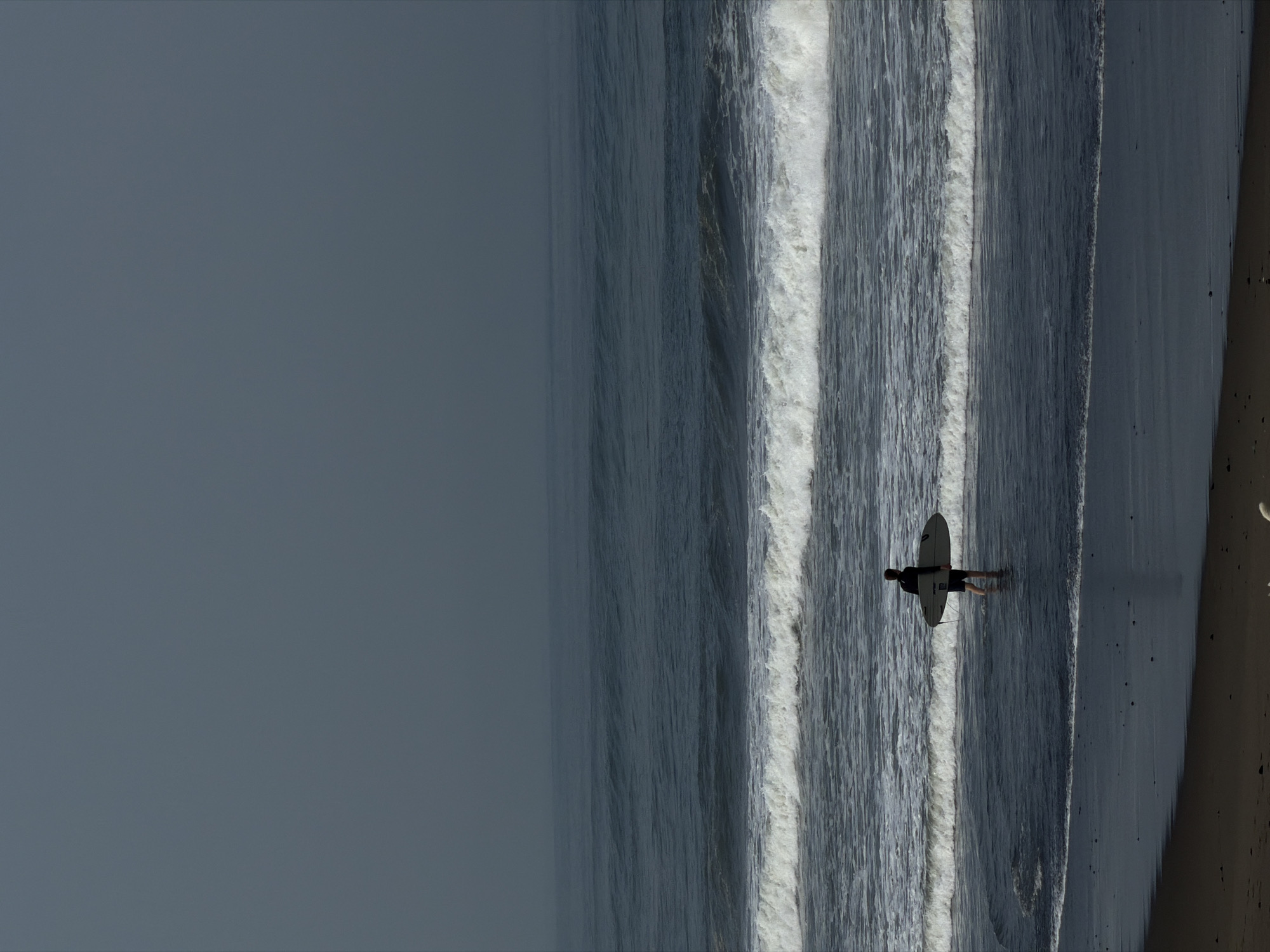 A solitary male, wearing dark attire, stands approximately waist-deep in the shallow ocean waters of Belalang, Indonesia. He holds a light-colored surfboard under his left arm and faces the open sea. The ocean water is dark blue-gray, exhibiting multiple lines of breaking waves with white foam. The immediate foreground consists of dark, wet sand sloping into the water. The sky is uniformly gray and overcast, extending to the horizon where it meets the sea.