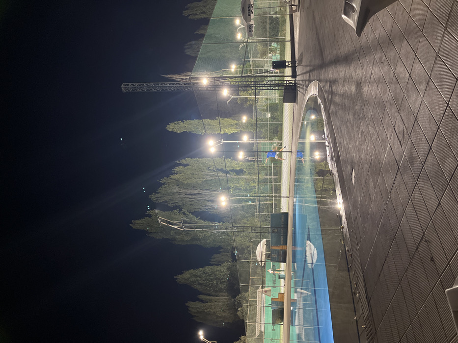 This nighttime image depicts an outdoor sports and recreation complex in Tirana, Albania
