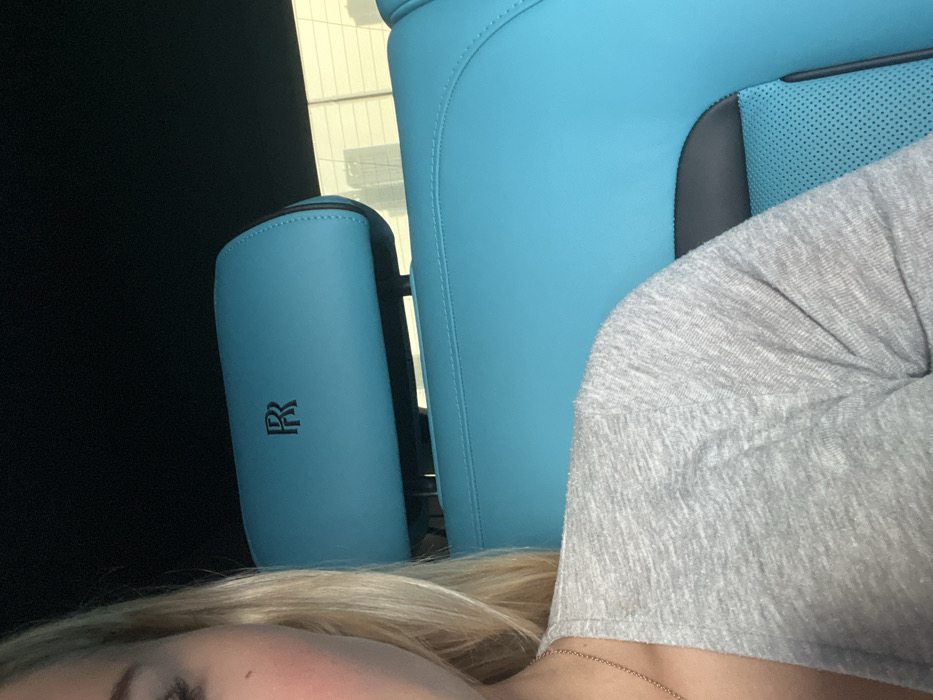 interior of a car, with the back seat of the vehicle facing the camera. The back seat is a vibrant blue color and features a headrest with a black "RR" logo in the middle. The person taking the photo is seated in the front passenger seat. The interior of the car is clean and well-maintained, with no visible damage or debris. The image was taken in the Business Bay district of Dubai, United Arab Emirates, at latitude 25.192 and longitude 55.264.