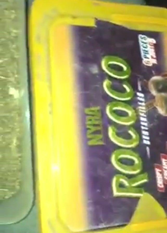 A hand opens a container of NYRA ROCOCO chocolate treats, revealing a clear plastic container filled with dried, green material interspersed with tiny, pale, round objects. The camera focuses on the green and white material.