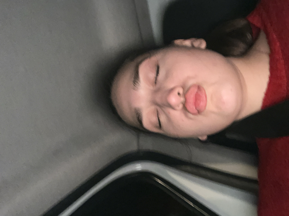 A low-light, close-up photograph displays a single female individual inside a vehicle interior. The subject's eyes are closed, and her lips are pursed into a "kissing" pose. She wears a red, textured garment, and a black seatbelt diagonally crosses her torso from left shoulder to right hip. The vehicle's grey headliner is visible above, while a white-trimmed door frame and dark window are present to the left of the subject. The seat appears dark. No visual cues within the image permit determination of a specific location within the city of Rennes, France.