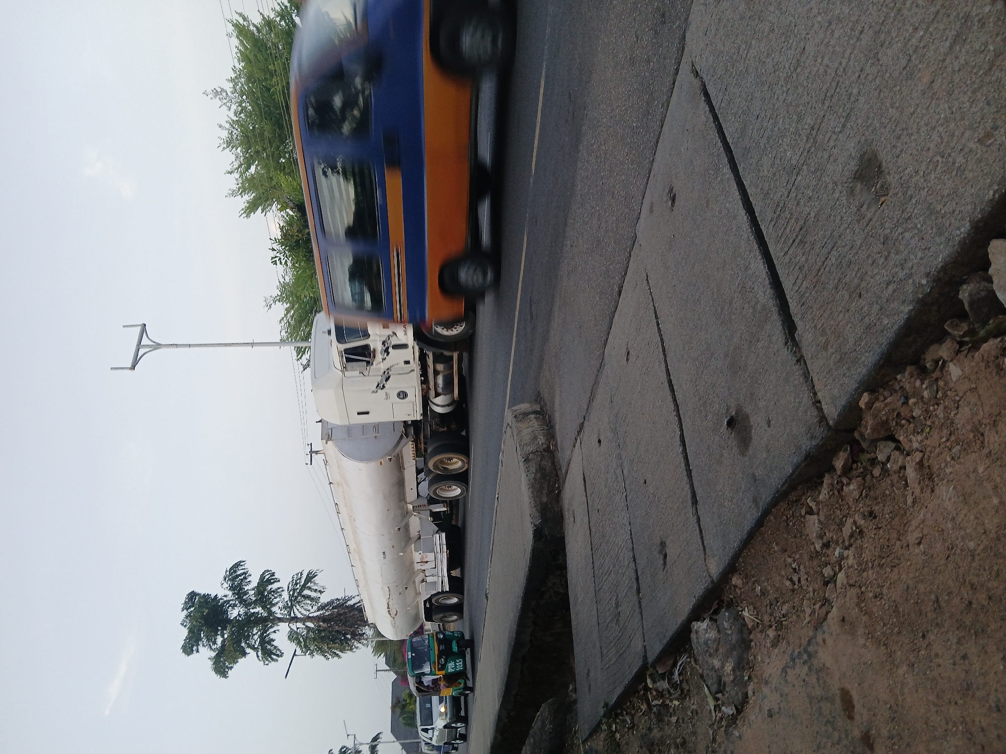This image captures a multi-lane urban road scene in Jos, Plateau State, Nigeria, viewed from a low angle beside a concrete sidewalk. The time of day appears to be either early morning or late afternoon under an overcast sky. In the immediate foreground, a weathered concrete sidewalk with visible expansion joints runs parallel to the road, featuring some erosion and exposed dirt/rocks along its edge. A concrete drainage channel separates the sidewalk from the paved asphalt road. Vehicular traffic is in motion, primarily traveling from left to right. On the far left lane, a silver SUV is followed by a green and yellow auto-rickshaw, locally known as a "Keke Napep," bearing the license plate "PTA-3215" (indicating Plateau State). At least one passenger's head is visible within the Keke Napep. To the right of these vehicles, a long white tanker truck, comprising a white prime mover and a cylindrical trailer, occupies an adjacent lane. Further to the right, a blue and orange passenger van is depicted with significant motion blur, indicating rapid movement through the frame. The background shows various trees, including a tall, slender tree with sparse green foliage on the left and denser green vegetation on the right. Utility poles with overhead wires are present. A tall, modern street light pole, characterized by a distinct "U" shaped horizontal fixture at its top, stands on the right side of the road, extending into the light grey sky.