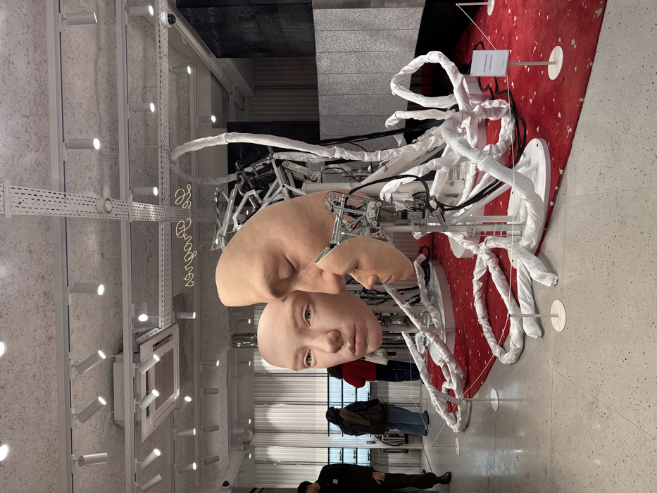 An unconventional art installation features a sculpture of two human heads fused, mechanically supported by white tubing and a steel framework