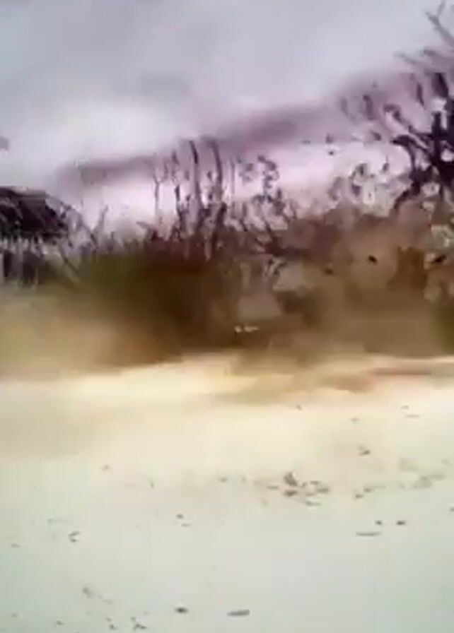 mushroom cloud forming over a desolate landscape. The ground appears flat and barren with scattered, bare trees or shrubs. The cloud is large and billows upward, a mix of white, gray, and hints of orange-brown.
