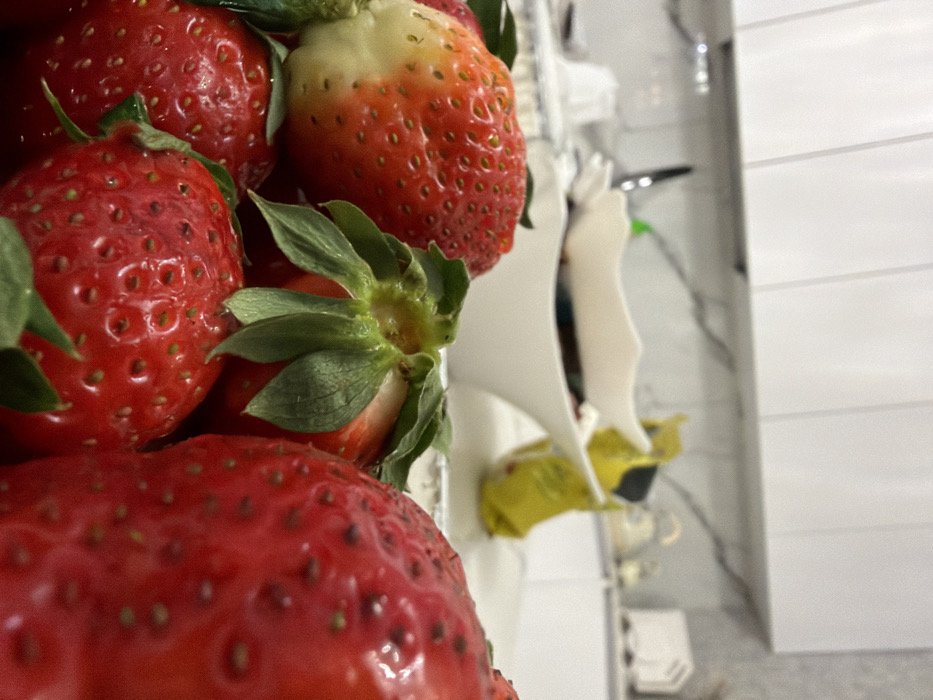 A close-up shot shows a vibrant cluster of fresh strawberries. Their red skin is speckled with tiny seeds and topped with bright green stems. The strawberries are slightly blurred in the foreground, while some are more in focus. White objects are blurred in the background, along with some yellow-wrapped treats, with a pale white surface at the right. The overall lighting is bright and warm.