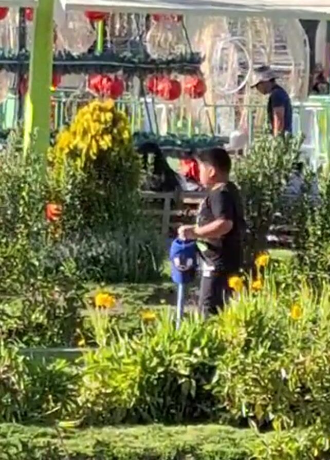sunny day in a public park. Various people are scattered around, enjoying the space. In the foreground, a young boy is playing with a toy watering can, walking between bushes. Behind him, a man in a hat stands near a decorative structure adorned with red lanterns. Other people are walking around, including a woman carrying a large sack on her back. In the background, there are statues, green painted posts, and covered benches. Some people are sitting on the grass, including a family with a checkered umbrella. The overall impression is a peaceful and relaxed atmosphere in a well-maintained park.