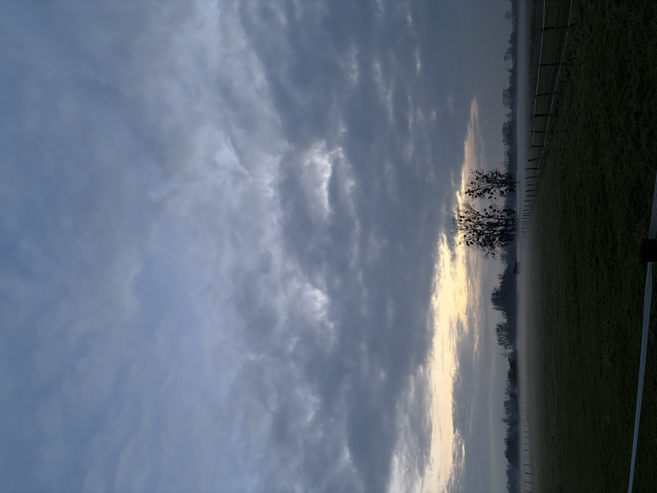 A landscape scene features a sky filled with textured, predominantly gray clouds, hinting at either dawn or dusk with a sliver of light breaking through. On the right, a field is divided by a fence, with trees lining the horizon, partially obscured by fog. The ground is a mix of green grass and mist. The photograph is taken at a low angle, accentuating the expanse of the sky.
