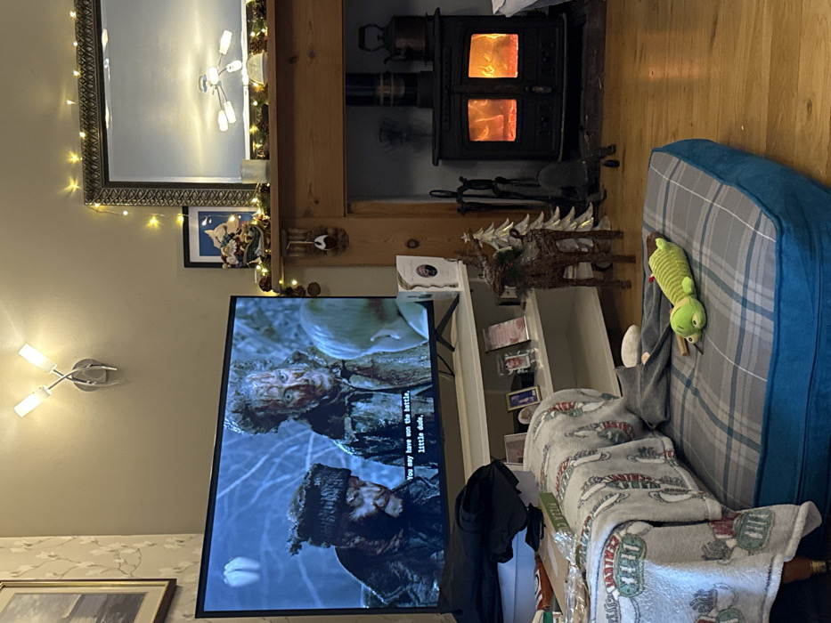 This image depicts a residential living room in Tideford, United Kingdom, characterized by a warm, evening ambiance. A large, wall-mounted flat-screen television is displaying a scene from what appears to be a film or television show. The screen shows three individuals: two adult males, both appearing distressed with dark substances (possibly dirt, blood, or mud) on their faces and clothing. The male on the left wears a dark fur hat, while the male in the center has prominent red stains on his face and chest. A third, fair-haired individual, possibly a child, is seen from behind, facing the two adults. Subtitles are visible at the bottom of the screen, stating: "You may have won the battle, little dude." Below the television is a white media console displaying framed photographs and other small items. A dark garment is draped over an unseen object in the lower left foreground, partially obscuring the media console. To the right of the television, a wooden mantelpiece is adorned with string lights and festive garland. A large framed mirror hangs above the mantel, reflecting a multi-arm ceiling light fixture. On the mantel, a decorative Santa Claus in a sleigh and other holiday ornaments are visible. Below the mantel, a dark, cast-iron wood-burning stove is actively burning, with visible flames behind its two glass doors. Fireplace tools are positioned to the left of the stove, and a copper kettle and another dark pot rest on the hearth to its right. The floor is composed of wooden planks. In the foreground, a large pet bed with a blue and grey plaid pattern occupies the center-right, featuring a green, worm-like plush toy. A grey garment is also on the pet bed. To the immediate left, a piece of furniture, possibly a couch, is covered with a grey blanket featuring a repeating pattern of holiday-themed mugs. A portion of a pizza box is visible on this furniture. A brown, wicker-like reindeer figure and several small white decorative Christmas trees stand on the floor to the right of the TV stand. A modern wall sconce with two upward-facing lights is mounted on the wall above the television. The walls are light-colored, with a patterned wallpaper section visible on the far left.