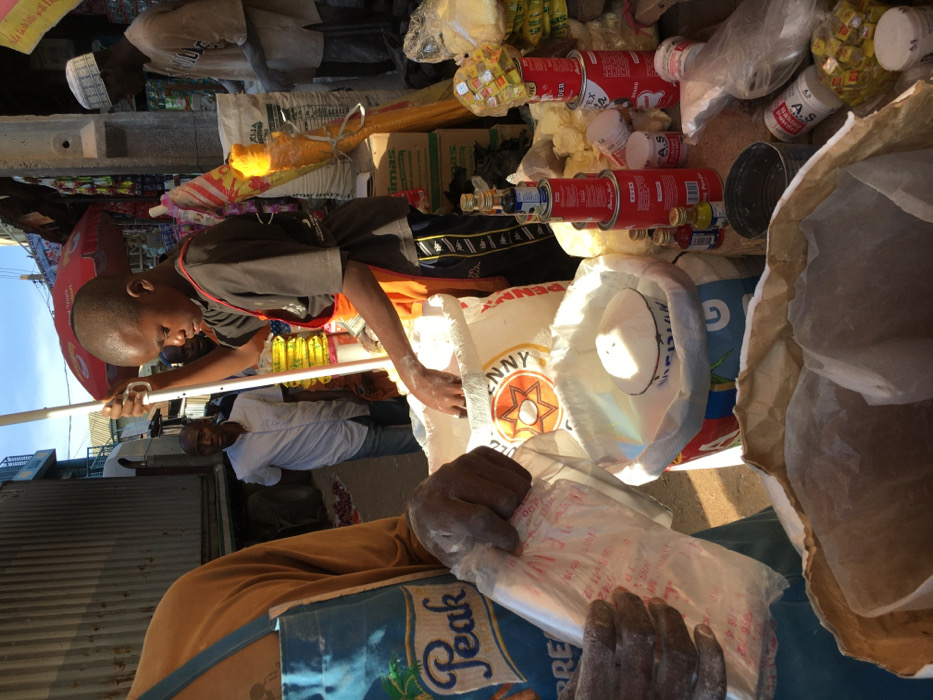 The image depicts an active outdoor market setting in Jos, Nigeria, under bright daylight. In the immediate foreground, the left side shows the torso and arms of an individual wearing a brown long-sleeved shirt and a blue apron bearing the "Peak" brand logo. Their hands, covered in a white powdery substance, hold a clear plastic bag. Directly to their right, a young male, likely a vendor, is centered. He has a shaved head, wears a black t-shirt, an orange apron, and dark track pants, and is actively handling white powder from a large white sack emblazoned with the "PENNY" brand and a star logo. He holds a white measuring scoop in his right hand, while his left hand is immersed in the powder. Adjacent to this sack, another open sack contains a white, bowl-shaped measuring scoop. To the right of the young vendor, a display of various goods includes stacks of red cans (some marked "TEX"), small yellow cuboid packets, and small bottles of colored liquids. In the mid-ground, behind the young vendor, a man in a light blue button-down shirt stands near the rear of a large commercial truck. Further right in the background, another man in a light brown traditional garment and a white cap stands, his hands also appearing dusted with white powder, near additional market displays. The environment indicates a busy commercial street or market area.