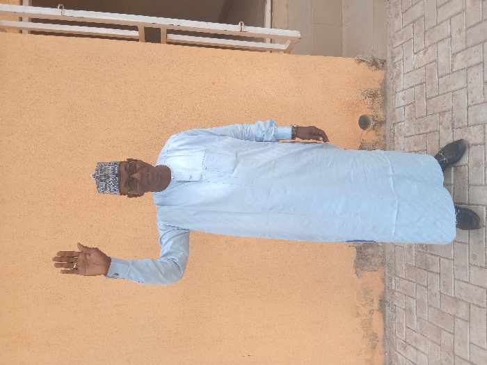 An adult male stands outdoors in Kabuga, Nigeria, centered against a plain, light orange-brown stucco wall