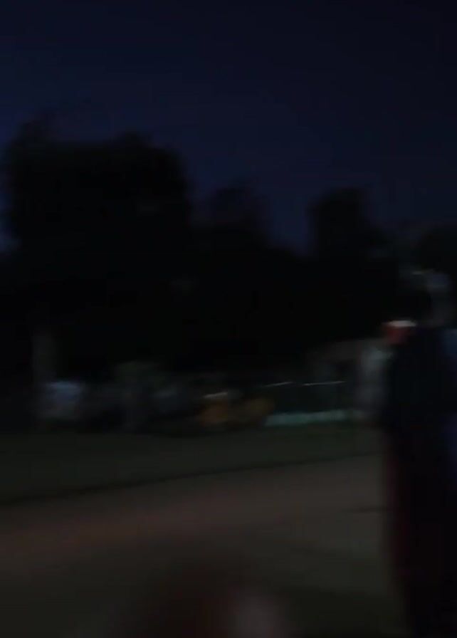 nighttime scene, initially depicting a shadowed archway or entrance with illuminated street lamps. The camera moves to reveal a gathering of people, mostly men, walking around and standing in an open area, some wearing traditional attire. The setting appears to be a street or public space with streetlights providing illumination. A building with a motorcycle parked nearby is visible, along with tables and chairs indicating a possible outdoor dining or gathering space. The overall atmosphere suggests an active public area at night.