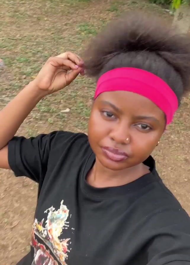 dark-skinned woman outdoors. She has her afro hair styled in a high bun with a bright pink headband. She wears a black t-shirt with a colorful graphic print on the front. Her nose is pierced with a stud. She is standing on a patch of dry grass and light dirt, and there are trees in the background. The woman moves her hand up to her hair at the beginning, then brings it down to her side. She looks at the camera and then holds up two fingers in a peace sign.