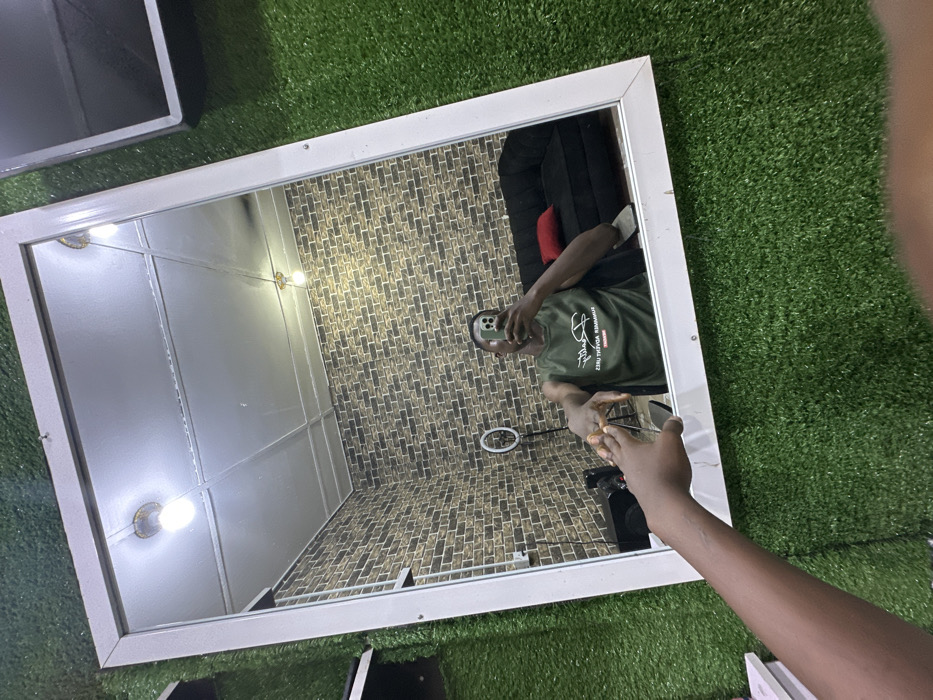 A mirror lies on a green artificial turf, reflecting a man taking a selfie. He's wearing a green shirt and holding a phone. The background features a brick-patterned wall, a black sofa with a red pillow, a ring light, and ceiling lights. Parts of objects, like a black box and a white stack, are visible near the mirror's edges. The mirror has a white frame.