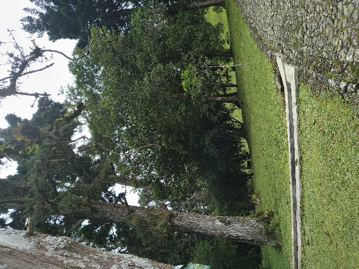 A natural setting with lush greenery, featuring tall trees with moss-covered branches stretching skyward. The scene includes a well-maintained grassy area alongside a stone wall with a concrete drainage channel. The landscaping appears to be part of a garden or park. The overall atmosphere is calm and peaceful, emphasizing the harmony between nature and landscape design.