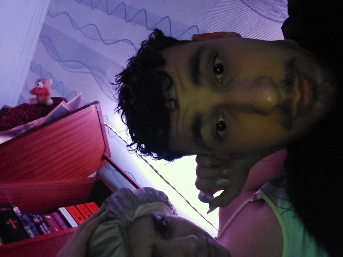 This image, oriented 90 degrees clockwise from a typical vertical perspective, depicts an indoor residential scene with two individuals. In the foreground, a male with dark, curly hair, a mustache, and a short beard looks directly at the camera. He wears a dark shirt, and his left hand is positioned near his ear. Behind him, partially visible to the left, is a female wearing a light-colored satin bonnet and a light tank top. Her left hand rests on her head, and her gaze is directed away from the camera. The background features a dark reddish-brown wooden cabinet or bookshelf with books, including one marked with a red cross, on the left. On the right, a wall is covered in light blue wallpaper with a wavy abstract pattern. A small, light brown stuffed animal holding a red heart is visible on a ledge. A string of decorative lights runs across the upper background. The lighting is dim with a pervasive purple-blue hue. The image lacks any identifiable landmarks or specific characteristics to determine its location within Gorna Oryahovitsa, Bulgaria.