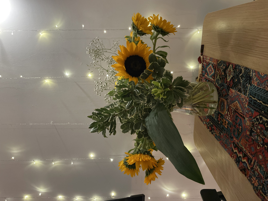 An indoor scene in Herzliya, Israel, depicts a bouquet of flowers on a light-colored wooden table. The bouquet, arranged in a clear glass vase containing water, consists primarily of sunflowers with prominent yellow petals and dark centers, complemented by white baby's breath and various green foliage, some of which is variegated. A long, dark green leaf is positioned prominently on the left side of the arrangement. A patterned fabric table runner, featuring geometric designs in hues of red, blue, and black, runs along the center of the table beneath the vase. In the background, a light-colored wall is adorned with multiple strands of warm white string lights, creating a soft, ambient glow. A dark, indeterminate object, possibly a chair back, is partially visible on the far left. No individuals are present in the image.