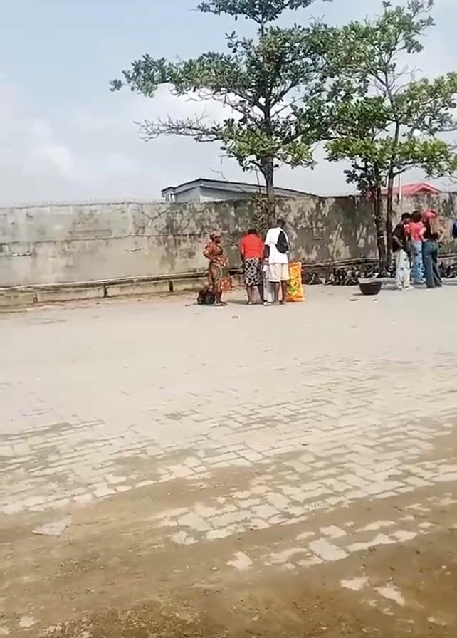 group of people in an open, paved area. To the left, a woman in a patterned dress and headwrap stands near luggage. A man in a red shirt and shorts stands with two other people near what appears to be a bag of goods. To the right of them, another group of people are standing near a tree and a black basin on the ground. A large, concrete wall runs along the back of the scene, with a building visible behind it. The pavement is a light, speckled gray and appears slightly wet. Two trees are positioned to the right of the group, under a partially cloudy sky.