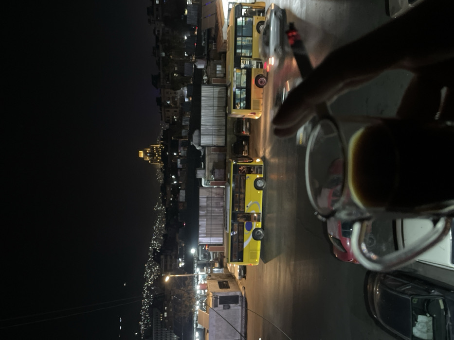 A cup of dark coffee is held in front of a nighttime city view. The city lights extend up a hillside to a large building at the summit. Below the buildings, a yellow bus is parked along a street alongside other vehicles. Streetlights illuminate the road. The image appears to be taken at night from a high vantage point, possibly a balcony or window. The focus is on the coffee cup.