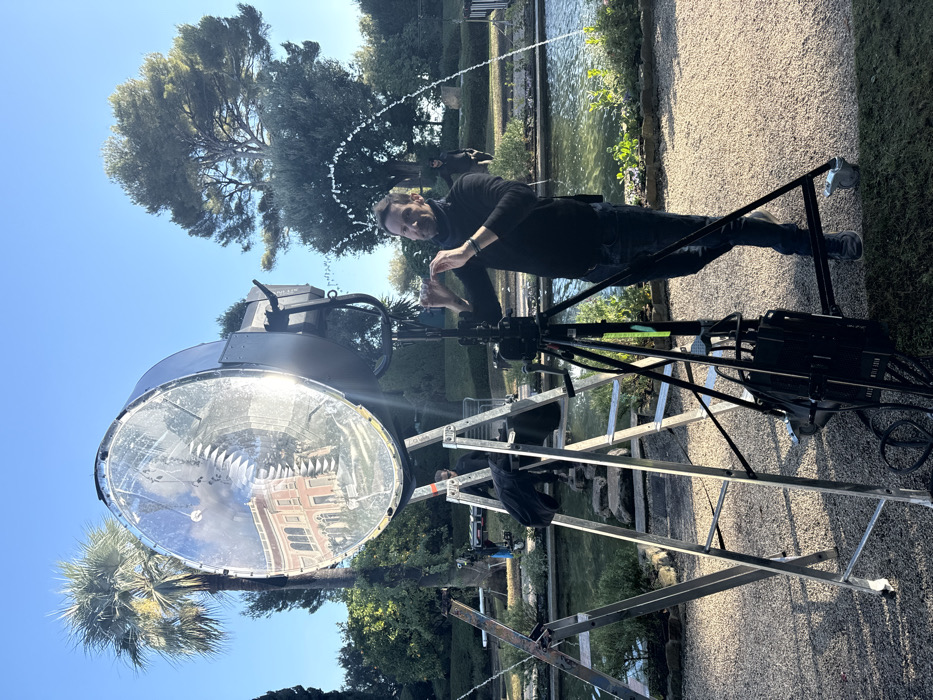 An outdoor scene depicts a production setup within a manicured garden, identified as an estate in the city of Unknown, Unknown. A large, circular film or photography light, actively emitting a bright beam, is centrally positioned on a wheeled heavy-duty tripod. Its reflective lens clearly mirrors a grand, multi-story, reddish-brown building with arched windows and light-colored trim. To the right of this light, a man in a black turtleneck and dark jeans stands beside a black camera tripod, his hands raised with fingers poised, suggesting an adjustment or framing action. Two silver A-frame ladders are set up behind the main light; a dark garment is draped over one. Partially obscured between the ladders, a second individual in dark clothing is visible. Further back and to the right, a third person in dark attire and sunglasses is faintly discernible near a long, rectangular water feature. This feature incorporates multiple active fountains, creating arcs of water. The ground consists of light-colored gravel and patches of grass. The background features lush vegetation, including prominent palm trees to the left and a large conifer tree to the right, beneath a clear blue sky.