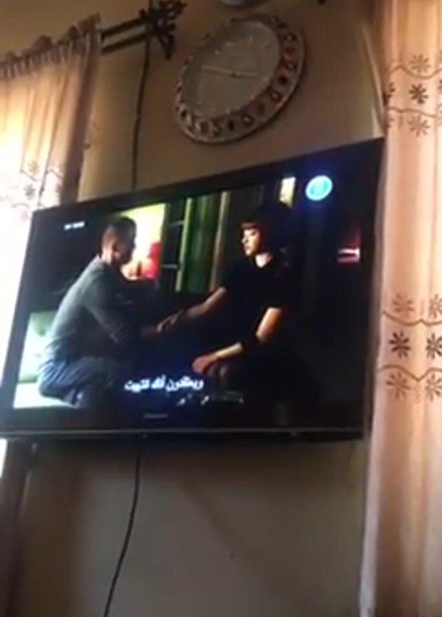 A Panasonic television is mounted on a wall. On the screen, a man and a woman are sitting in chairs and talking to each other. The man is wearing jeans and a gray shirt. The woman is wearing a black dress. The text on the bottom of the screen is in Arabic. Above the television is a decorative clock and a musical instrument. There are patterned curtains on either side of the television.