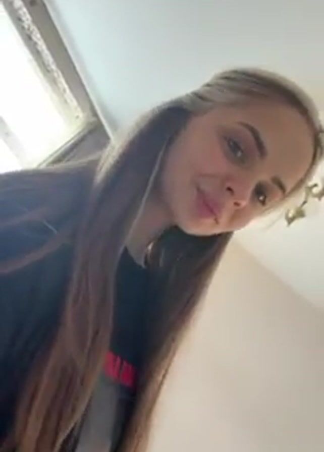 A young woman is looking at the camera from slightly above. Her hair is brown with blonde highlights and she is wearing a black shirt with red lettering. Music plays in the background. The scene is indoors with a window and curtains visible in the background.