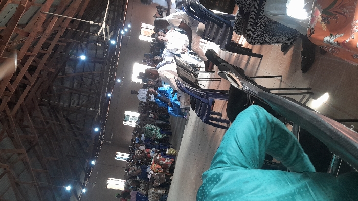 This image depicts a large indoor gathering within a hall in Akwanga, Nigeria