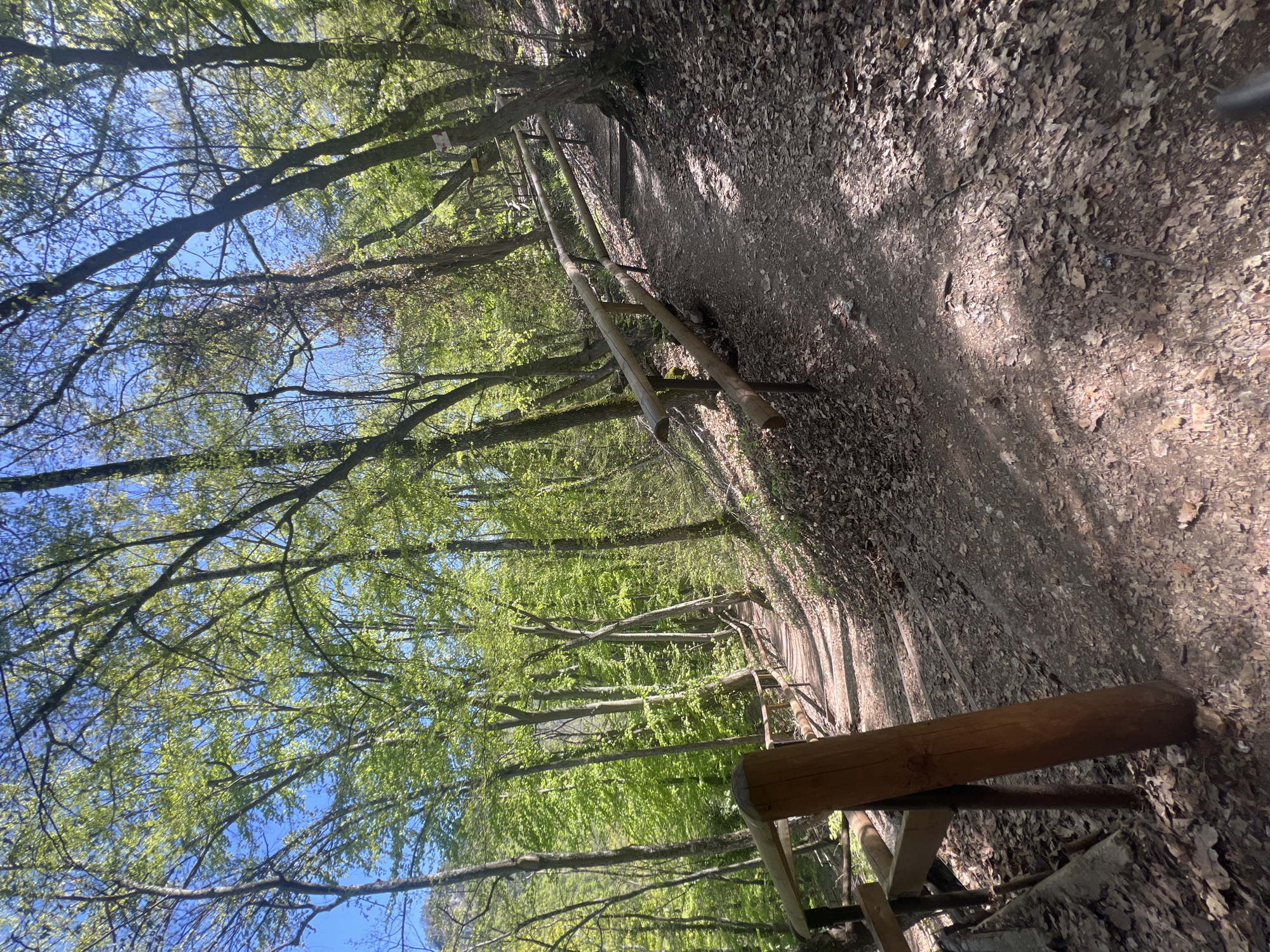 dirt path in a forest in Peshtera, Bulgaria. Trees with green leaves form a canopy overhead, with glimpses of blue sky. A wooden fence runs alongside the path in sections. The ground is covered in fallen leaves. The lighting suggests it is daytime.
